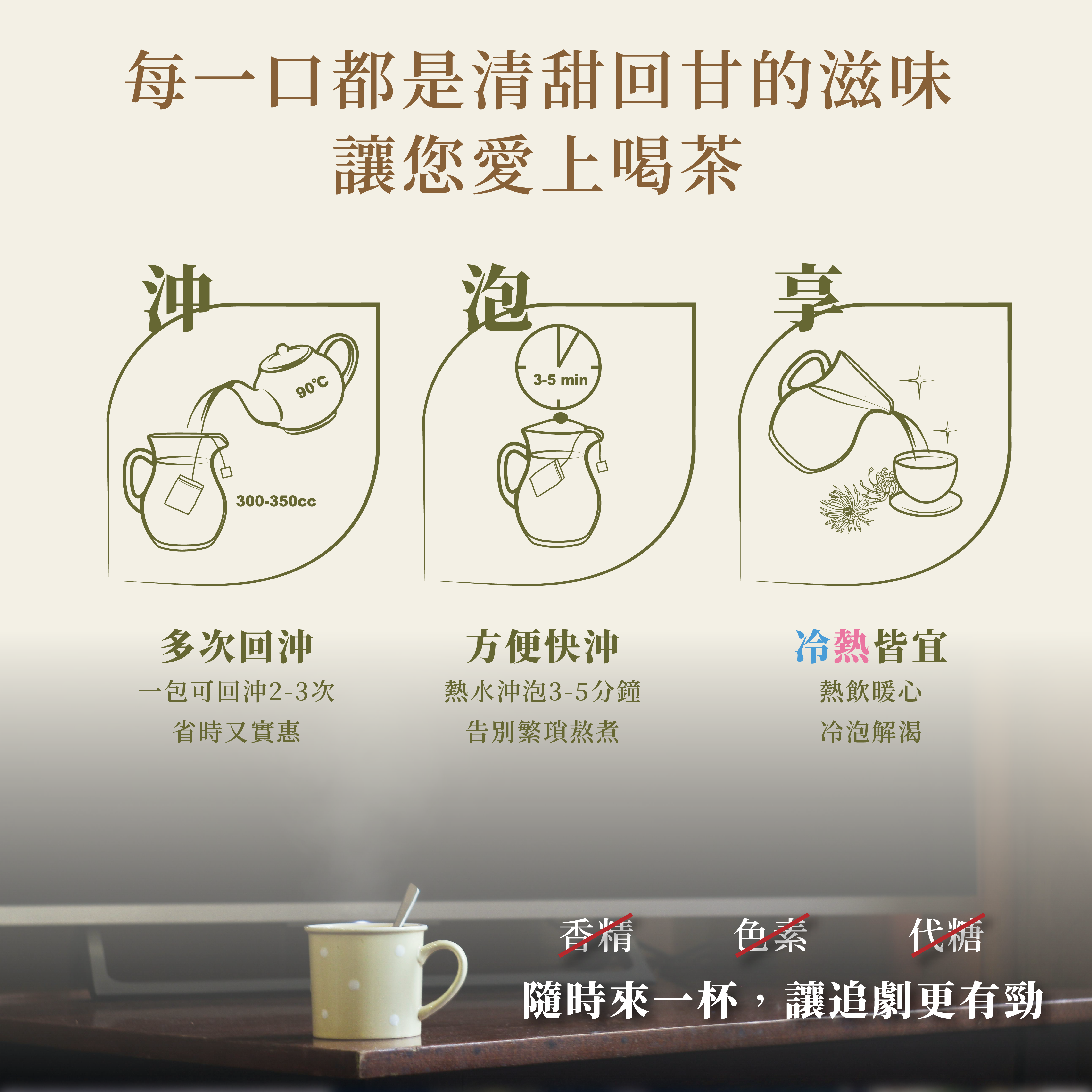 專業充填鎖住鮮度,冷熱皆宜,可回沖,隨時享受草本茶香
